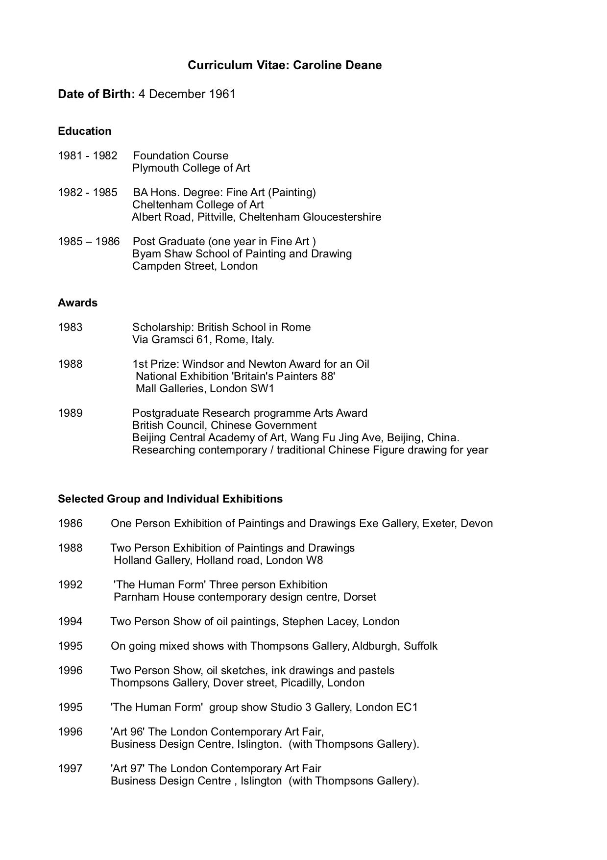 Caroline Deane graduated from among other establishments the British School in Rome, Beijing’s Central Academy of Art and London’s Byam Shaw School of Art. In recent years she has been exhibiting her work both in China and in London. She has also been exhibited regularly with several central London art galleries as well as being featured annually in national art fairs both in and outside of London since 2002.